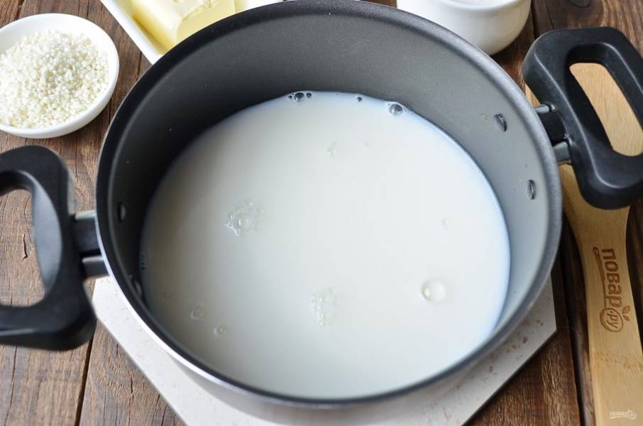 В антипригарную кастрюлю перелейте молоко, доведите его до кипения.