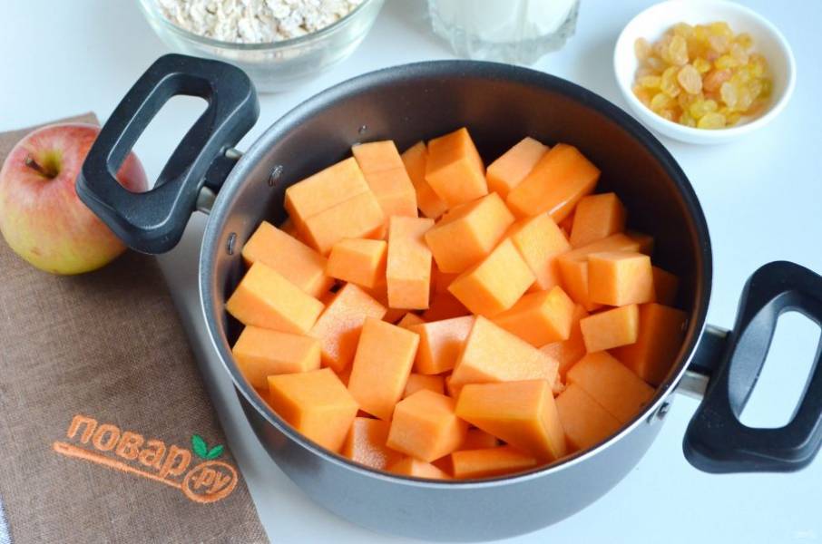 1. Подготовьте продукты. Приступим. Тыкву очистите от кожуры и внутреннего волокнистого края, порежьте кубиками.