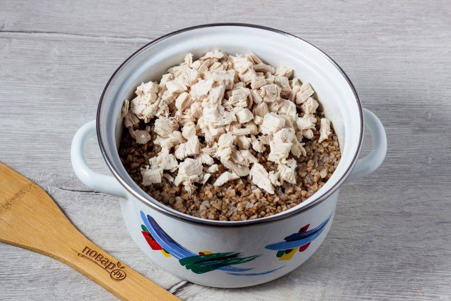Грудку нарежьте небольшими кусочками и добавьте в кашу.