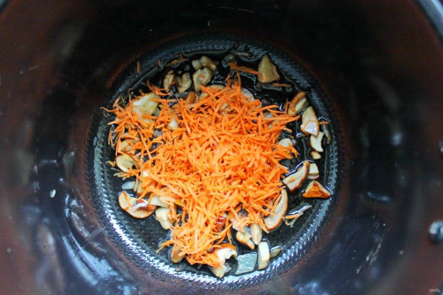 Морковь натрите на средней терке и добавьте в чашу мультиварки, тушите еще 5 минут.