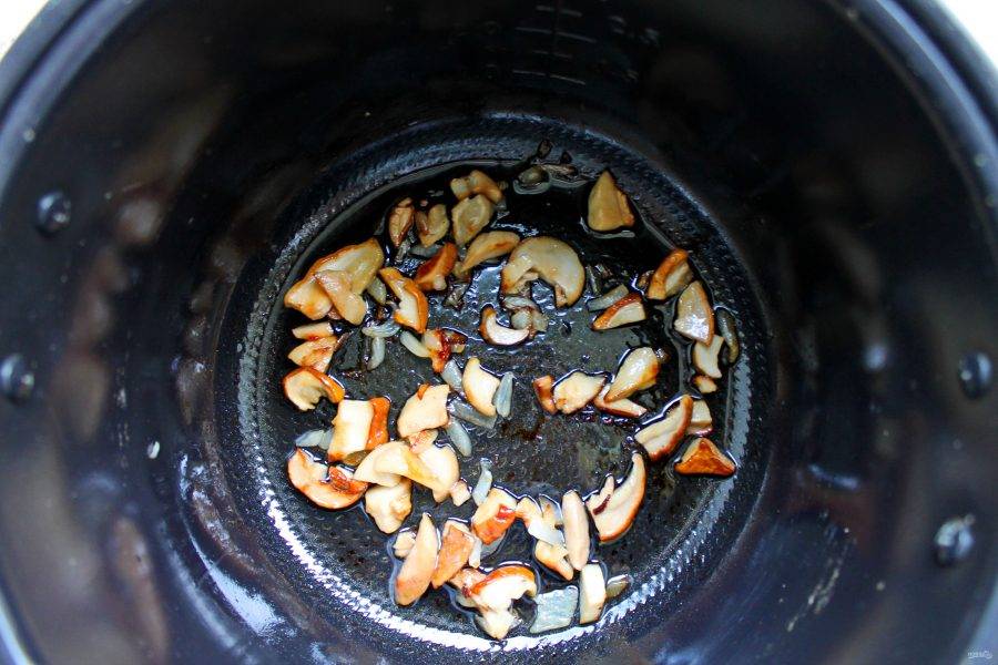 В чашу мультиварки налейте растительное масло и выложите мелко нарезанный репчатый лук и порезанные грибы. Обжаривайте все на режиме "Выпечка" в течение 15 минут.