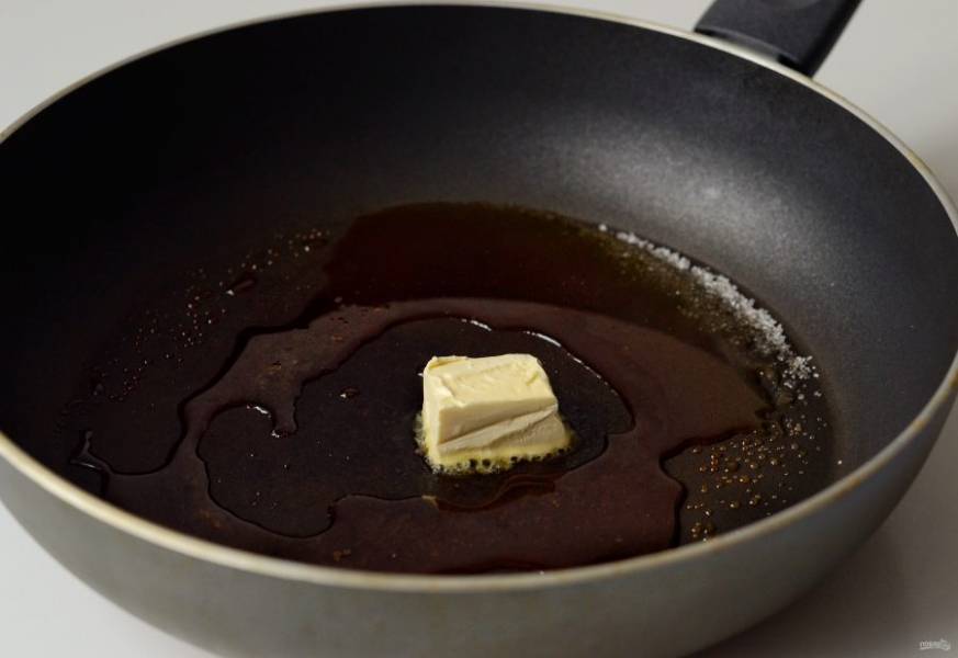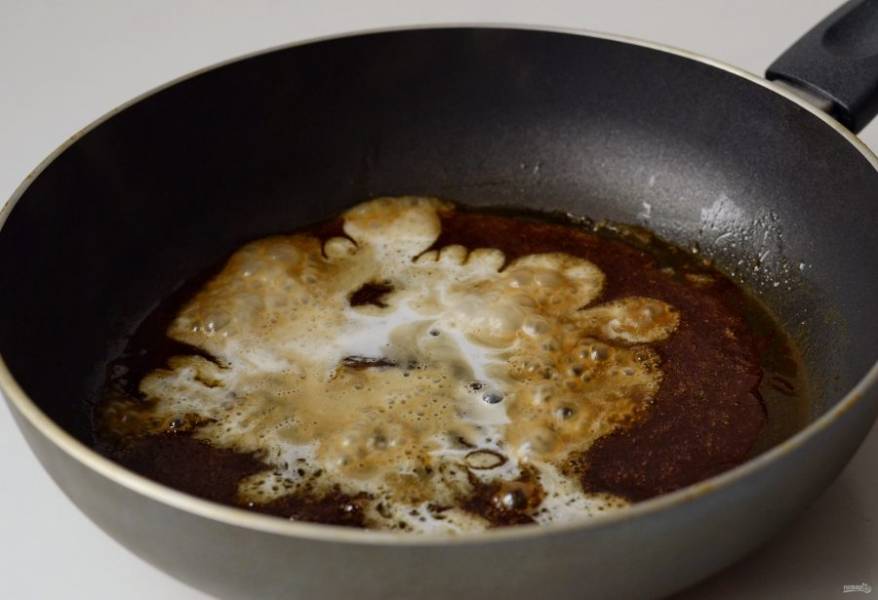 На среднем огне растопите сахар до жидкого состояния. Добавьте кусочек масла, перемешайте.