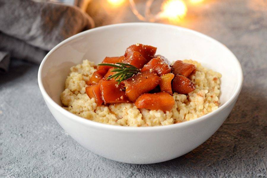 Выложите кашу в тарелку, добавьте карамелизованную тыкву. Приятного аппетита!