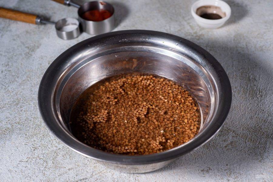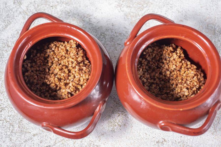 Разложите гречневую крупу по двум глиняным горшочкам (объем одного горшочка 450 мл).
