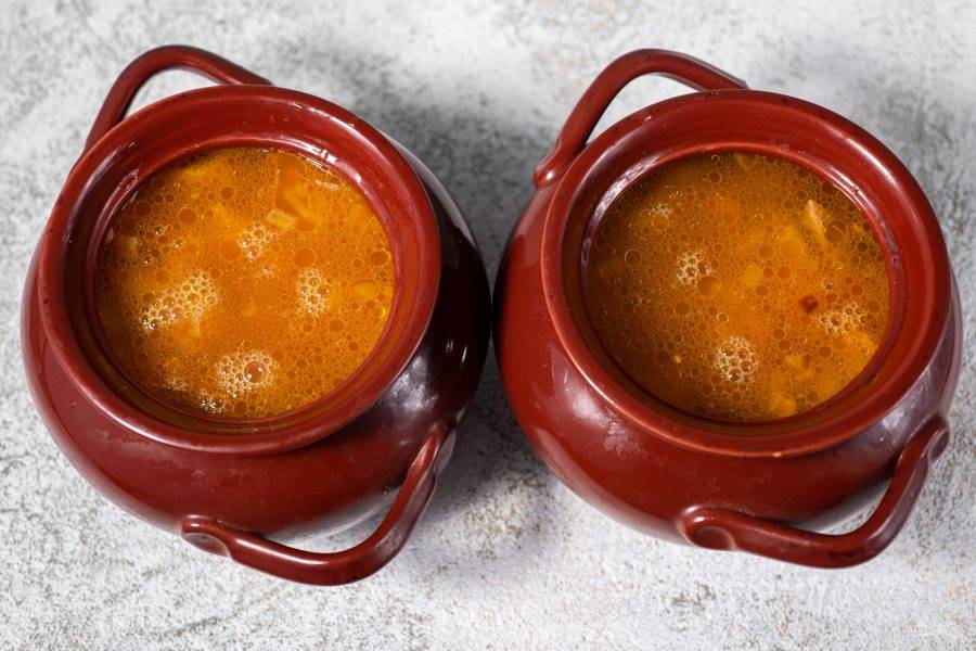 Долейте поверх только что закипевшую воду так, чтобы уровень воды не доходил до края горшочков примерно на 0,5 см. Горшочки накройте крышкой и отправьте в уже разогретую до 180 градусов духовку. Готовьте 30 минут.
