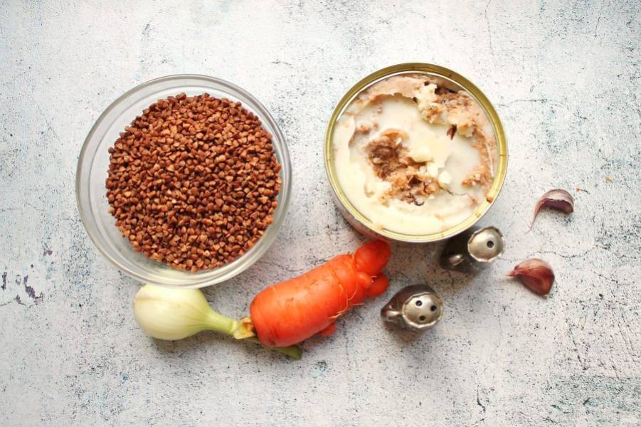 Гречу хорошо промойте и добавьте в кастрюлю с тушенкой и овощами.