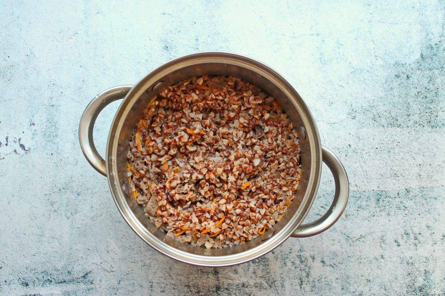 Все посолите, поперчите, налейте горячую воду. Она должна быть выше гречки на 2 сантиметра.