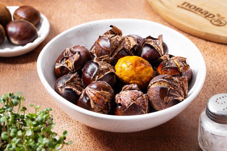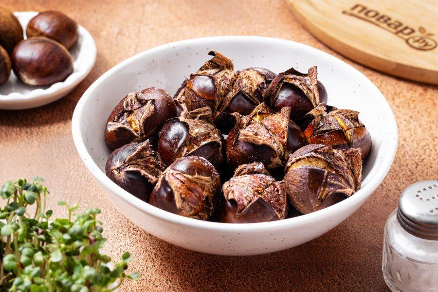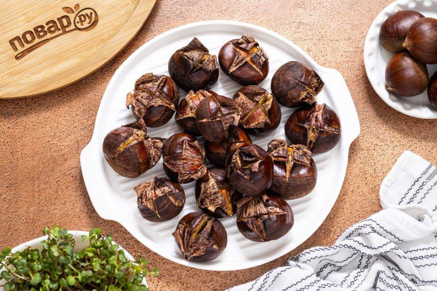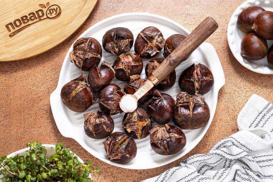 Готовые каштаны должны стать мягкими, легко протыкаться ножом, а скорлупа должна стать хрупкой, легко отделяться.