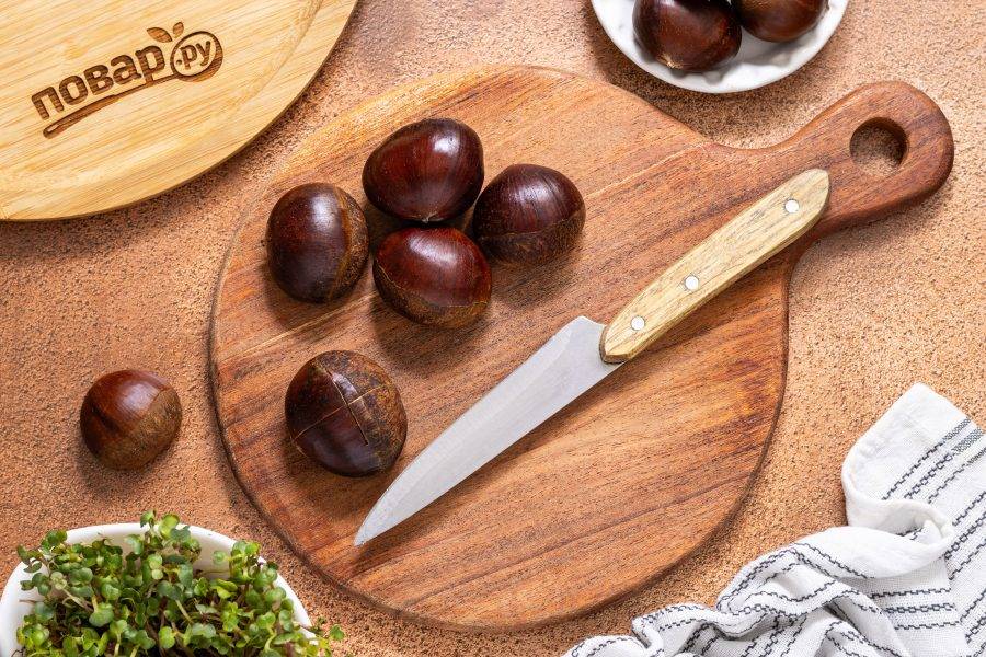 Острым ножом на выпуклой стороне сделайте надрез крест-накрест примерно на треть каштана.