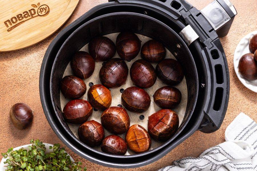 Аэрогриль заранее разогрейте в течение 10 минут на температуре 200 градусов. Затем разложите на решетке каштаны.