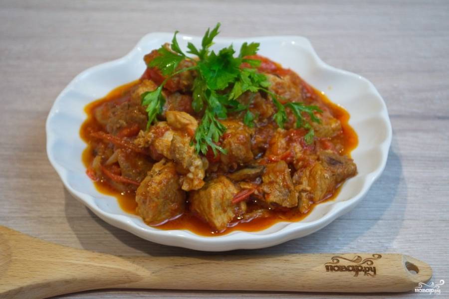 Влейте стакан томатного сока или добавьте томаты в собственном соку. Тушите около 1 часа, помешивая. В конце приготовления добавьте специи, соль. Тушите до готовности. Выключайте.