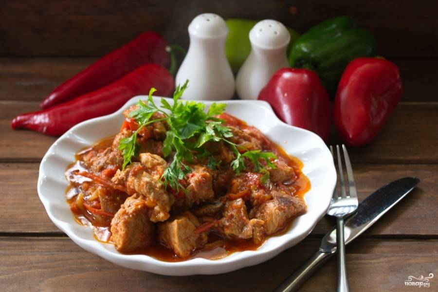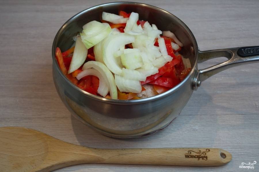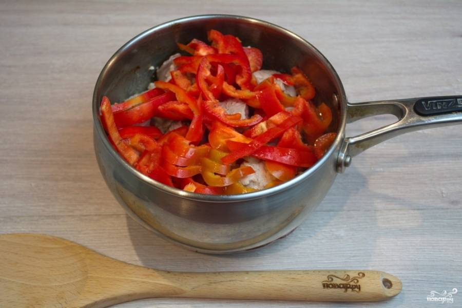 Когда мясо обжарится, добавьте нарезанный болгарский красный перец.