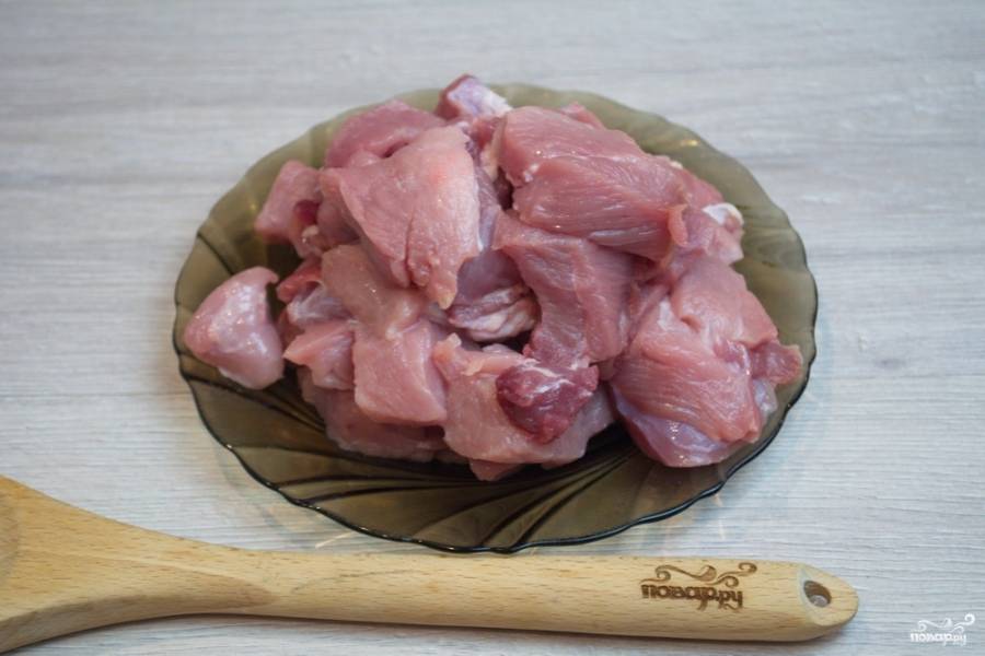 Для приготовления свинину нам нужно вымыть и обсушить. Мясо нарежьте небольшими кубиками, но не слишком мельчите. Мясо после приготовления должно оставаться мягким и сочным. Слишком маленькие кусочки мяса отдадут весь сок в бульон, а само мясо будет жестким. Итак, мясо нарезаем кубиками. Можно использовать свинину. Реже каварму делают из курицы.