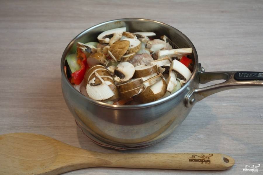Добавьте в кастрюлю нарезанные шампиньоны. Я использую королевские шампиньоны, но можно брать любые.