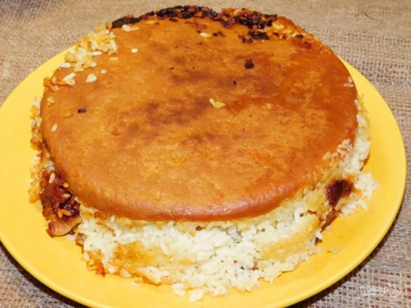 Выложите плов на большую тарелку, а сверху лепешку казмах. Подавайте к столу. Приятного аппетита!