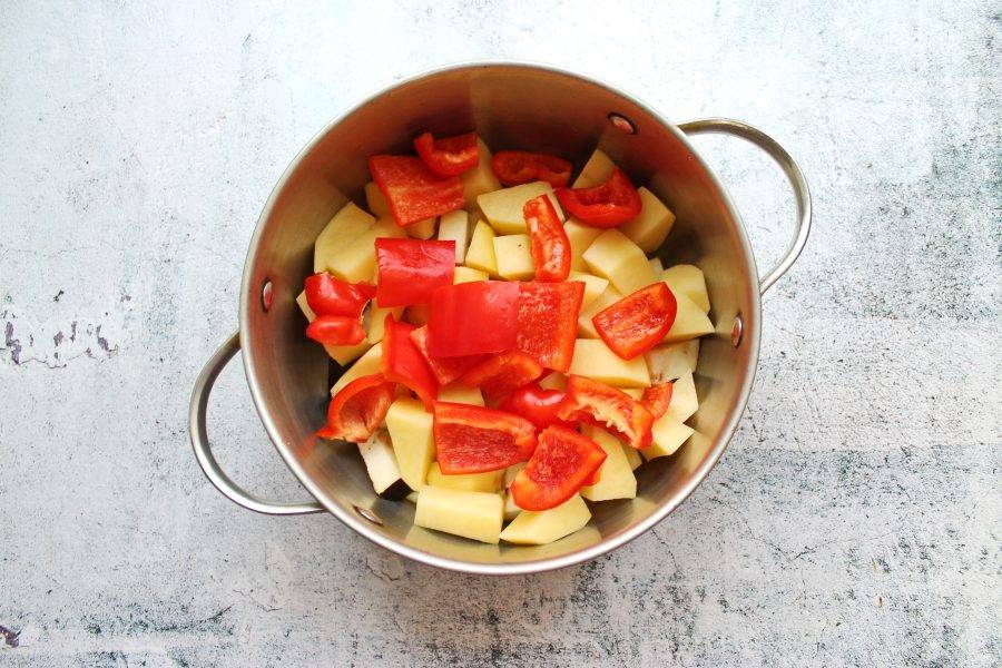 У болгарского перца удалите плодоножку и семена, порежьте крупными кусками и выложите к картофелю и баклажану.