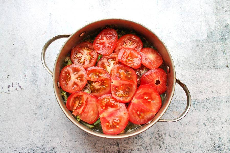Достаньте кчуч из баранины и выложите сверху порезанные кольцами помидоры.