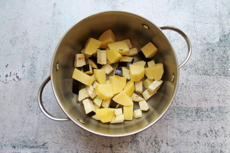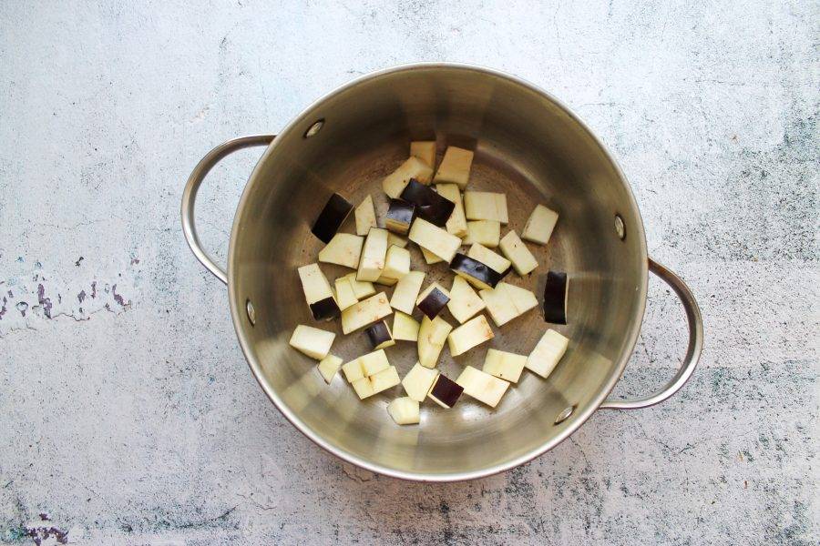 Баклажан вымойте и порежьте крупным кубиком, выложите в кастрюлю.