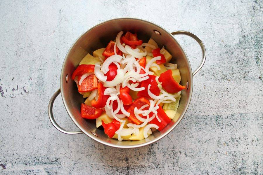 Репчатый лук почистите и порежьте полукольцами, добавьте в кастрюлю.