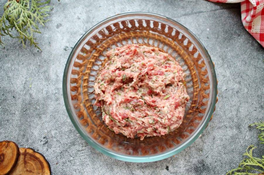Все хорошо перемешайте и отбейте до плотного фарша. Для этого соберите его в руку, поднимите над чашей и бросьте обратно. Сделайте так 10-15 раз, уберите в холодильник на три часа.