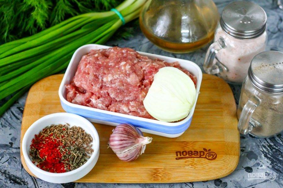 Подготовьте указанные ингредиенты. Фарш заранее приготовьте из зачищенного мяса обеих сортов, используя мясорубку. При недостатке баранины используйте свинину.