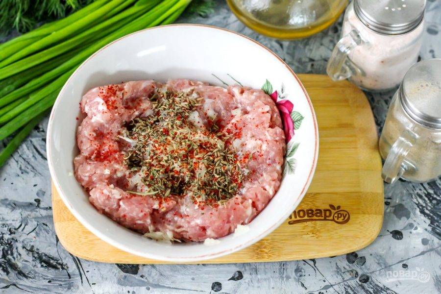 Всыпьте в емкость специи и пряности, соль. Тщательно вымешайте фарш в течение 10 минут, затем поместите в холодильник на 30 минут. После извлеките и еще раз тщательно вымешайте, вбирая его в руки и бросая обратно в емкость, чтобы выбить воздух. Делать это нужно обязательно, практически до белых нитей, чтобы мясная масса схватилась между собой как следует и не распалась в процессе жарки.