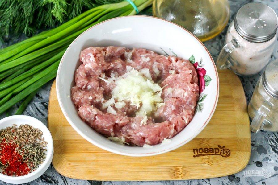 На терке с мелкими ячейками натрите в емкость с фаршем очищенные и промытые репчатый лук и зубчики чеснока.