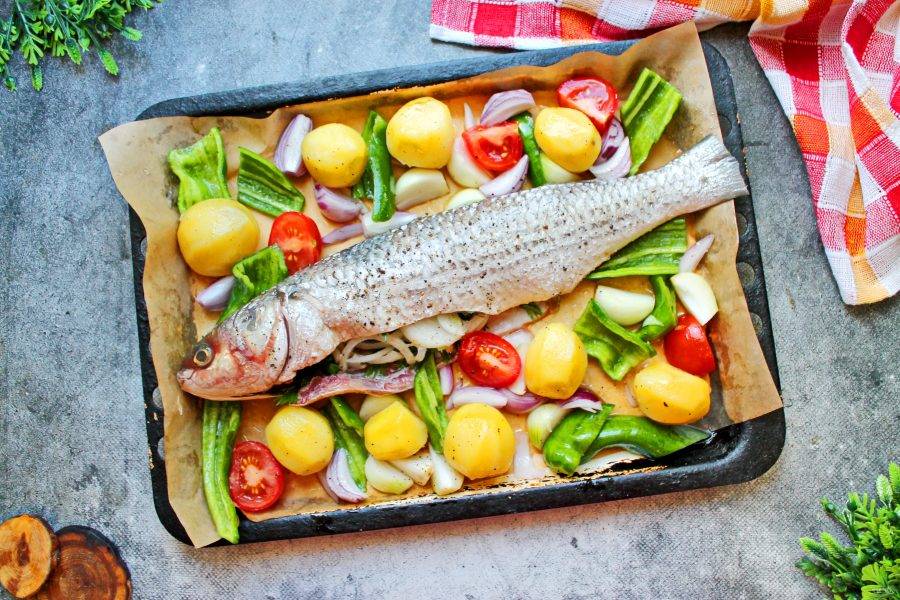 Противень застелите пергаментом и выложите кефаль, чтобы она полностью уместилась. Разложите вокруг рыбы подготовленные овощи.