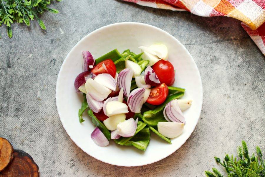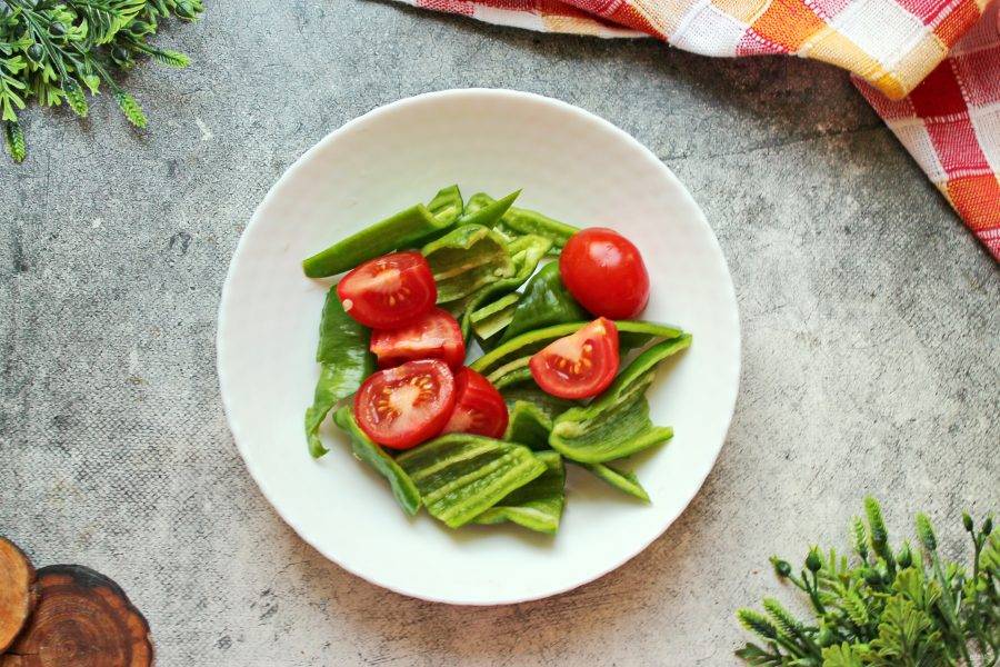 Помидоры разрежьте на крупные части и выложите к перцу.