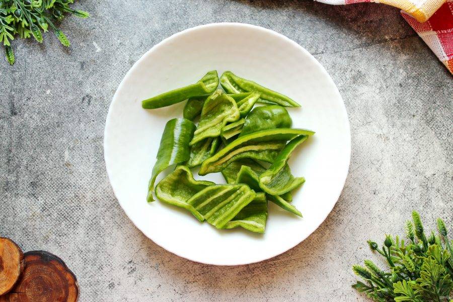 У болгарского перца отрежьте плодоножку и удалите семена. Порежьте перец на куски и выложите в миску.