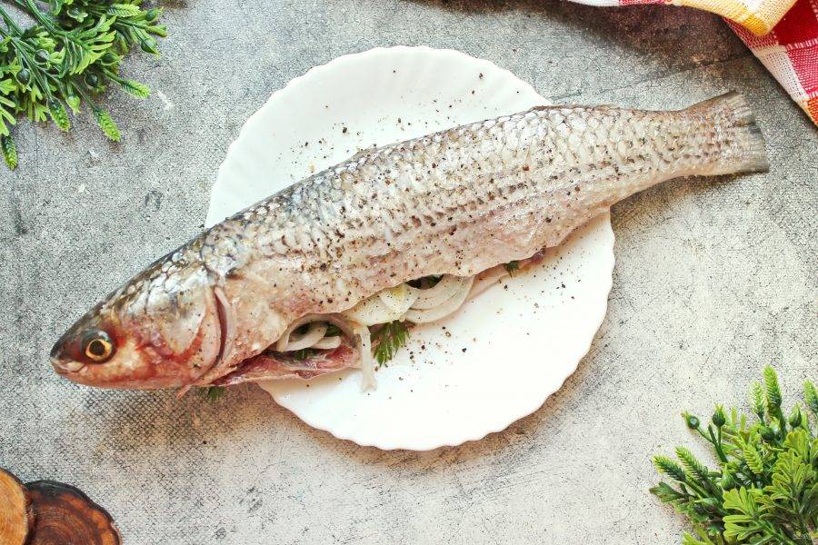 Вторую половину репчатого лука порежьте полукольцами. Кефаль посолите внутри и выложите порезанный лук внутрь брюшка.