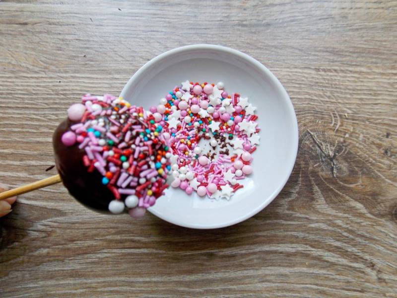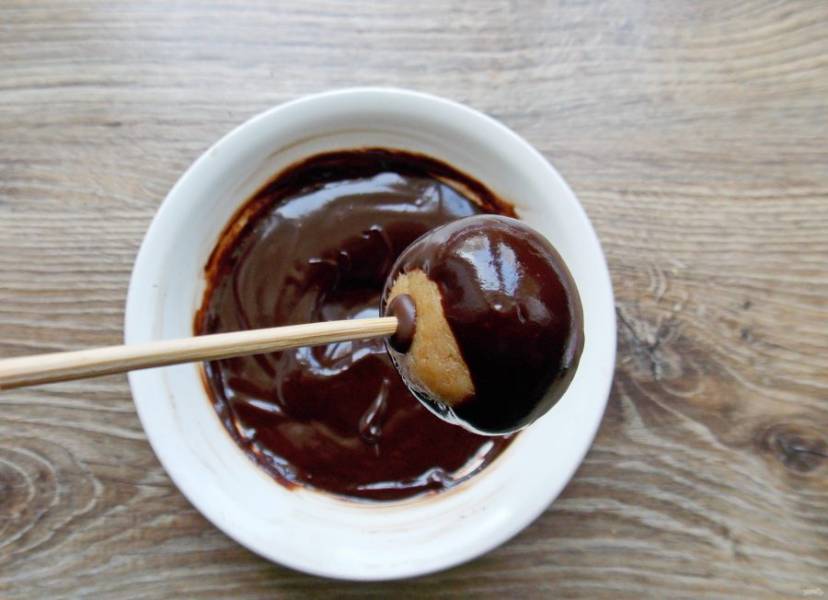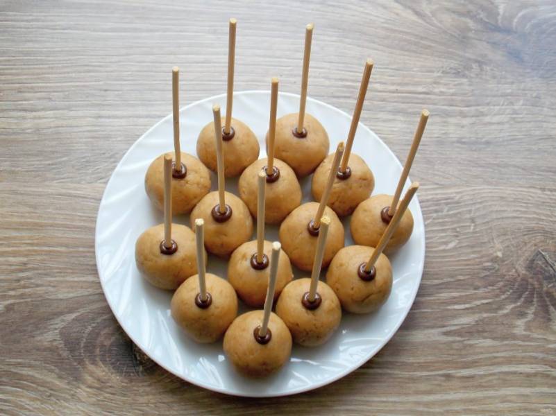 Сразу воткните палочки шоколадным концом в подготовленные шарики. Поставьте снова на 30 минут, чтобы шоколад застыл.