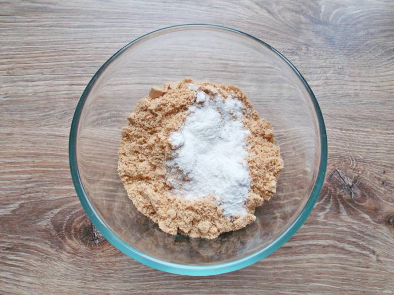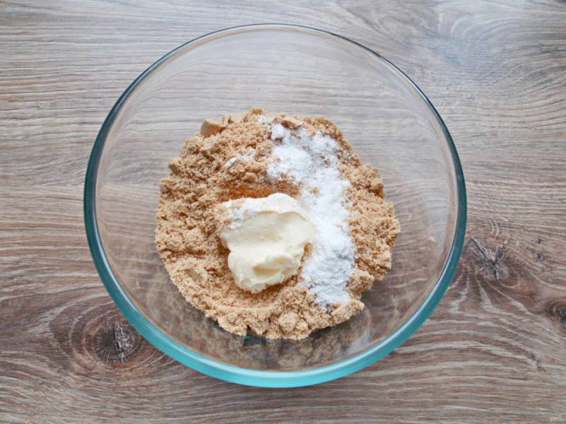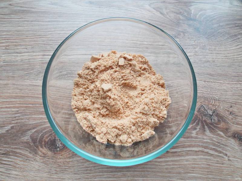 Песочное печенье поломайте и измельчите в мелкую крошку. Положите ее в миску.