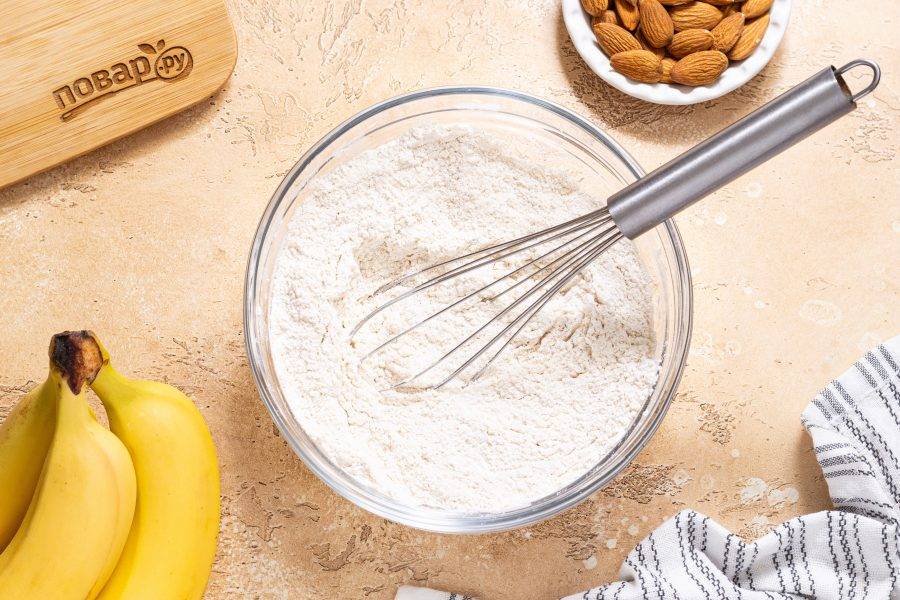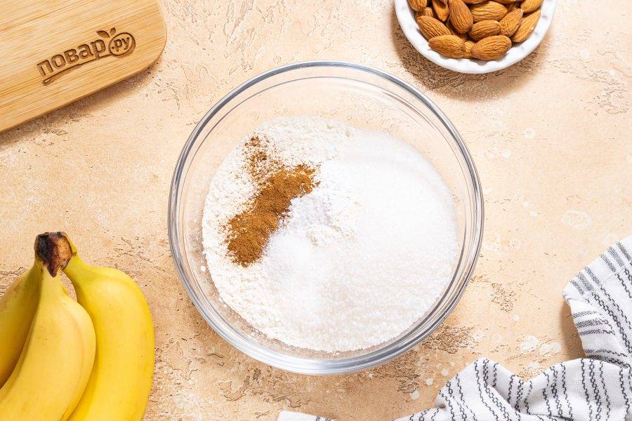 Просейте в глубокую миску пшеничную муку. Добавьте все сухие ингредиенты: сахар, молотую корицу, соль и разрыхлитель.