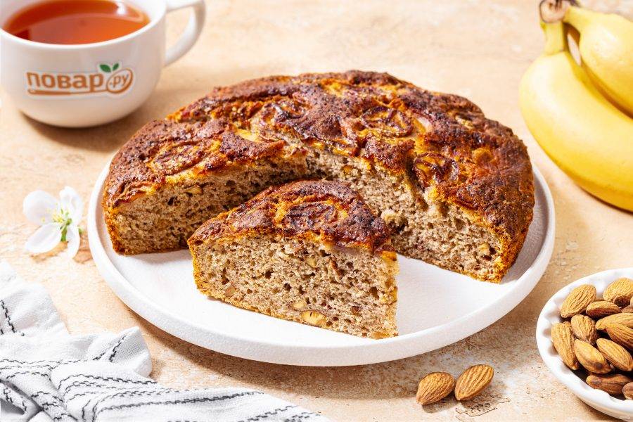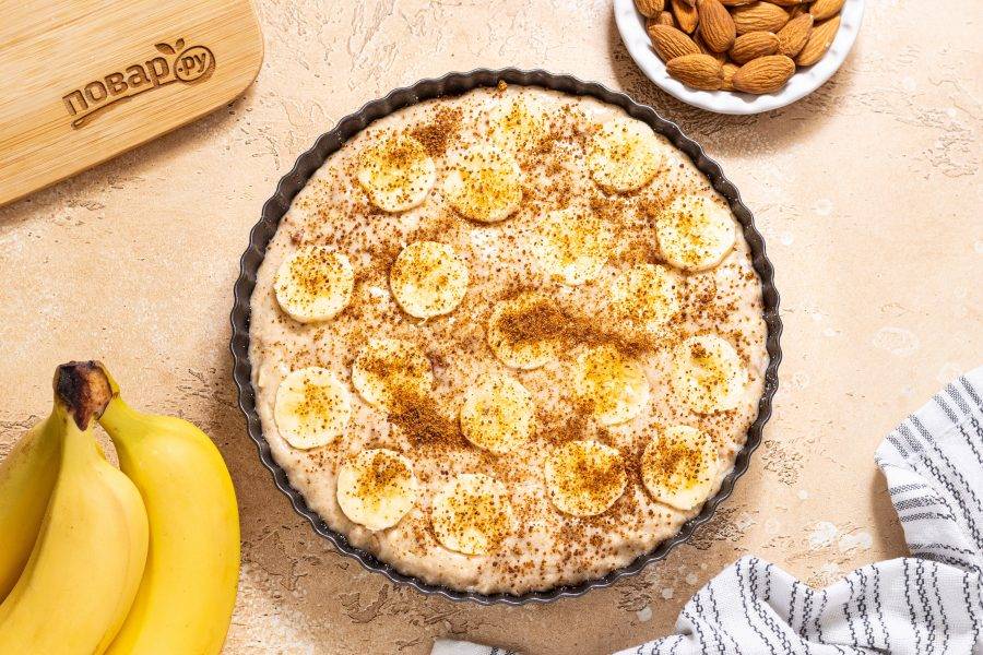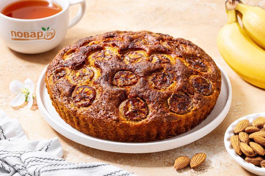 Сверху добавьте нарезанный кружочками банан — чуть вдавите его в тесто и присыпьте коричневым сахаром. Выпекайте кекс в разогретой до 180 градусов духовке около 50-60 минут или до сухой шпажки. После дайте кексу остыть 10-15 минут в форме, а затем его можно доставать и полностью остудить на решетке.