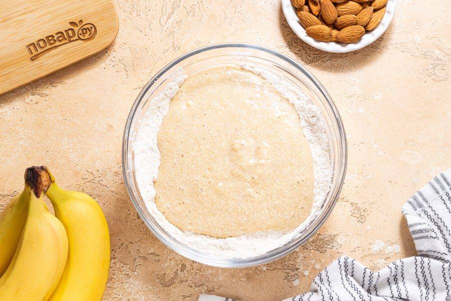 Получившуюся смесь добавьте в миску к сухим ингредиентам.