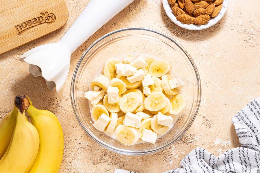 Бананы очистите от кожуры, нарежьте кружочками. Отмерьте нужное количество по весу. Измельчите блендером в отдельной посуде вместе с молоком и мягким сливочным маслом до однородности.
