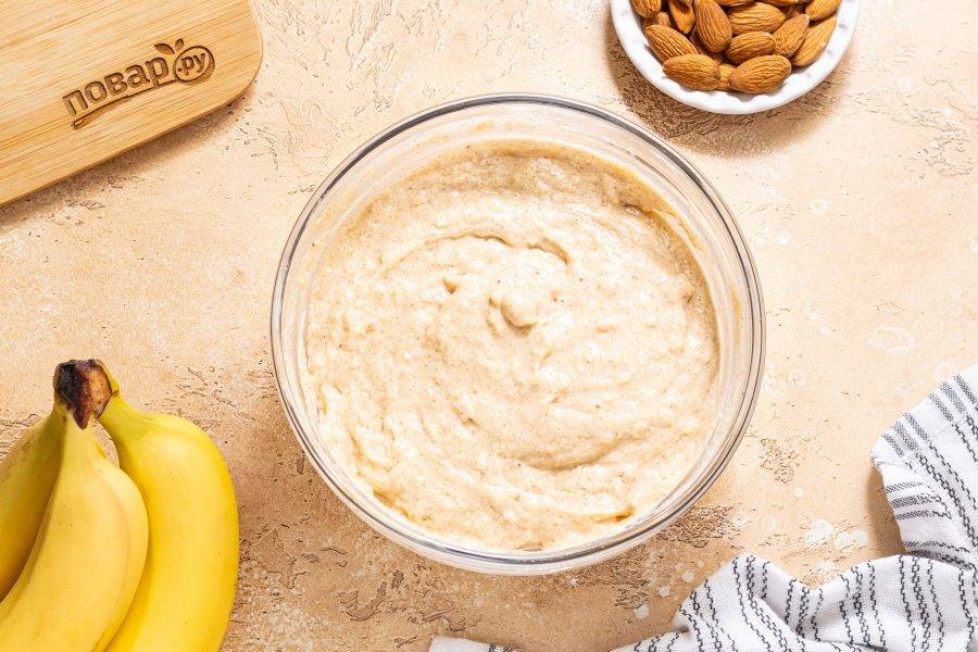 Перемешайте так, чтобы жидкая часть объединилась с сухой, но не сильно вымешивайте тесто.