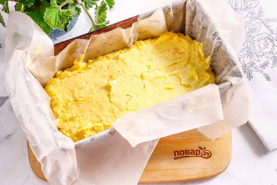Застелите форму для выпекания пергаментной бумагой, смажьте ее маслом и выложите в форму тесто. Поместите форму в духовку и выпекайте кекс около 40-50 минут.
