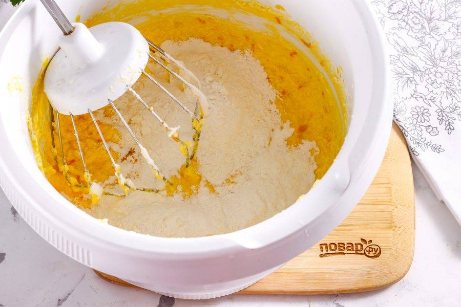 Всыпьте пшеничную муку и разрыхлитель, вмешайте ее в тесто на малых оборотах техники. Разрыхлитель добавлять обязательно!