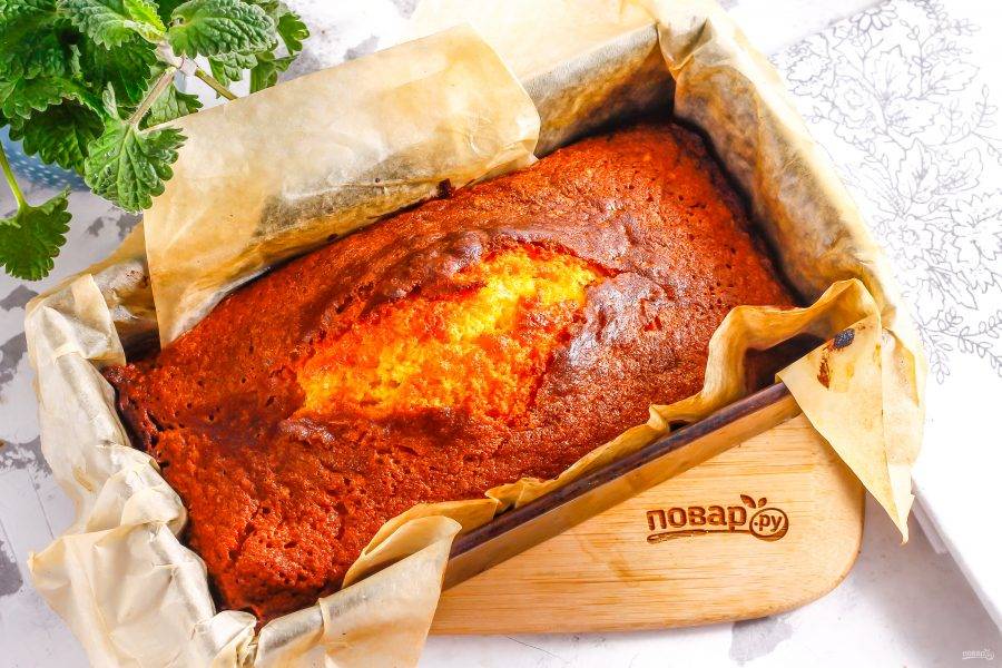 Готовый кекс извлеките из духовки и переверните форму на бок, чтобы кекс не осел, не сдулся. Оставьте его в таком виде до полного остывания, примерно на 1-2 часа. Разрезать нужно только холодный десерт!