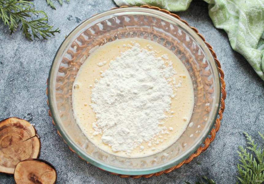 Муку смешайте с разрыхлителем и просейте в мандариновую массу. Аккуратно перемешайте до однородного теста, которое похоже на сметану.