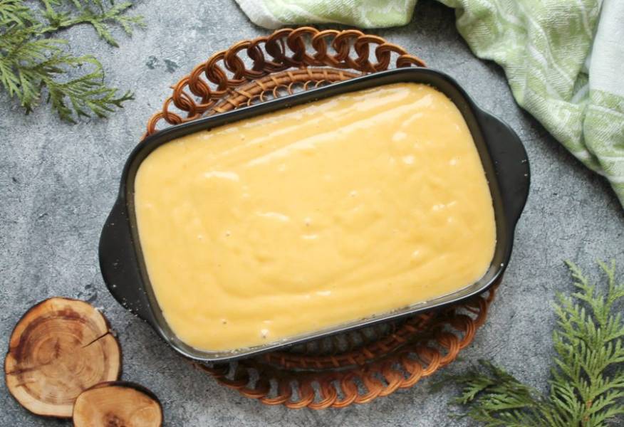 Форму для выпечки 20 на 14 сантиметров смажьте растительным маслом и обсыпьте панировочными сухарями. Перелейте в нее тесто и разровняйте.