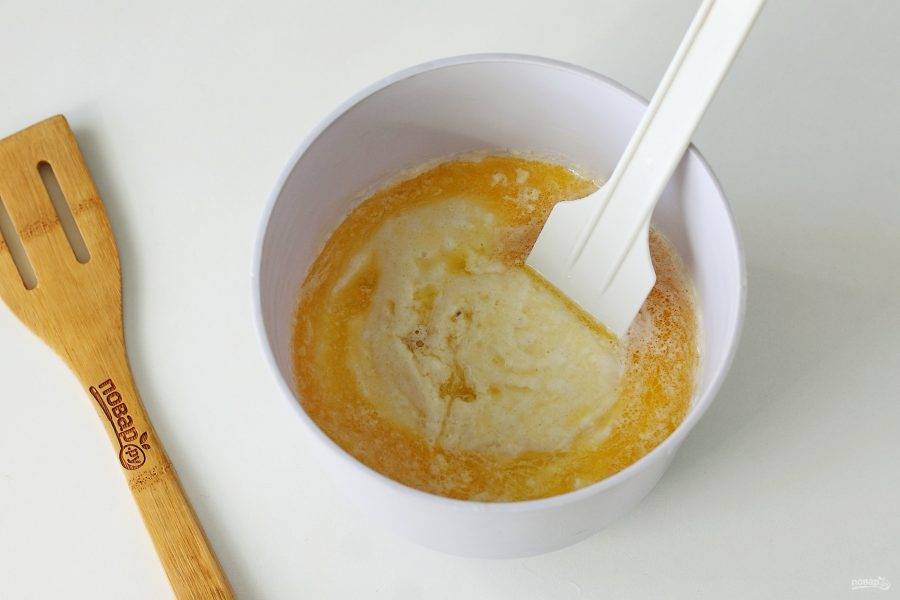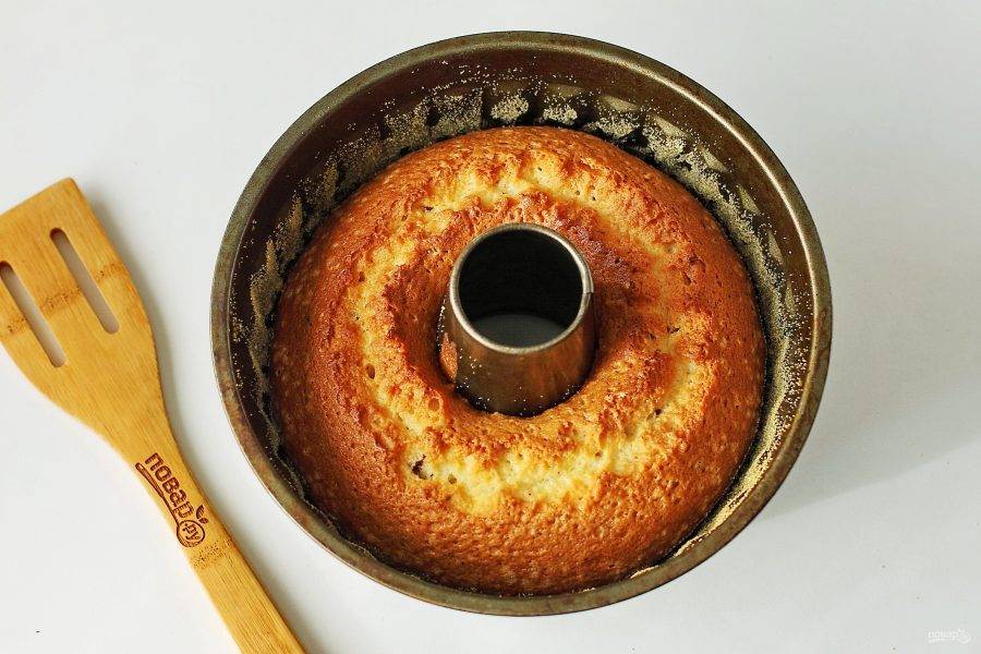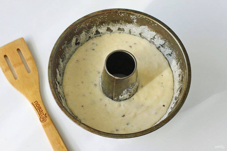 Форму для выпечки смажьте маслом. Дно и бока обсыпьте мукой или манкой и вылейте тесто. Выпекайте в духовке при температуре 180 градусов около 40-50 минут.