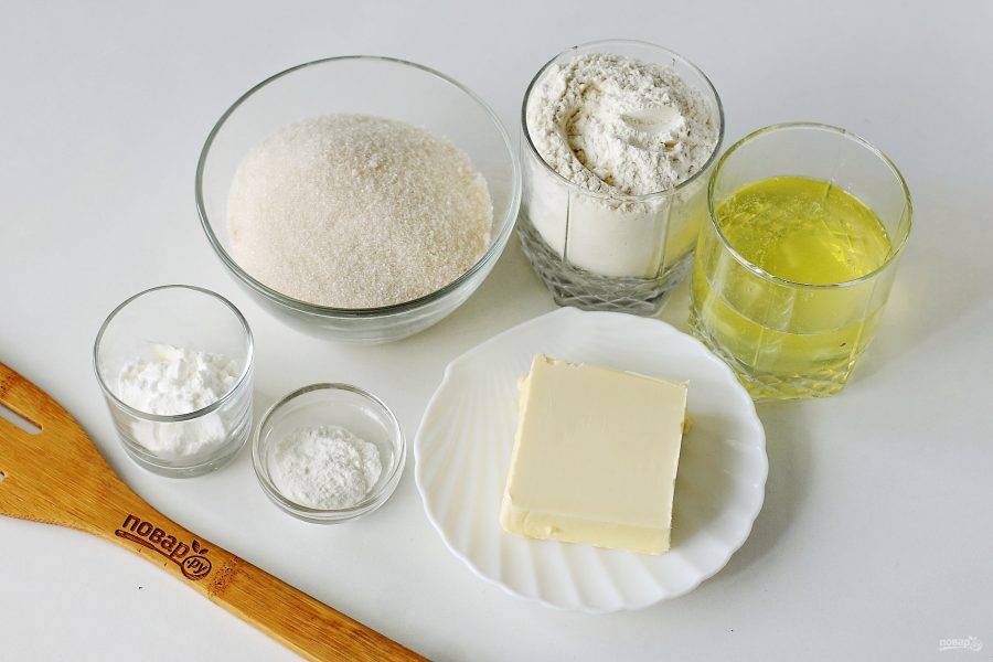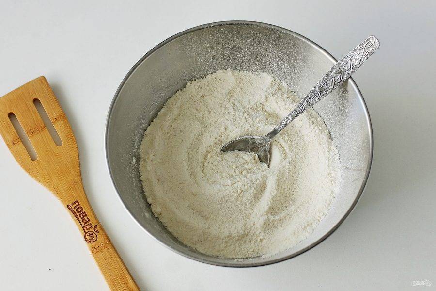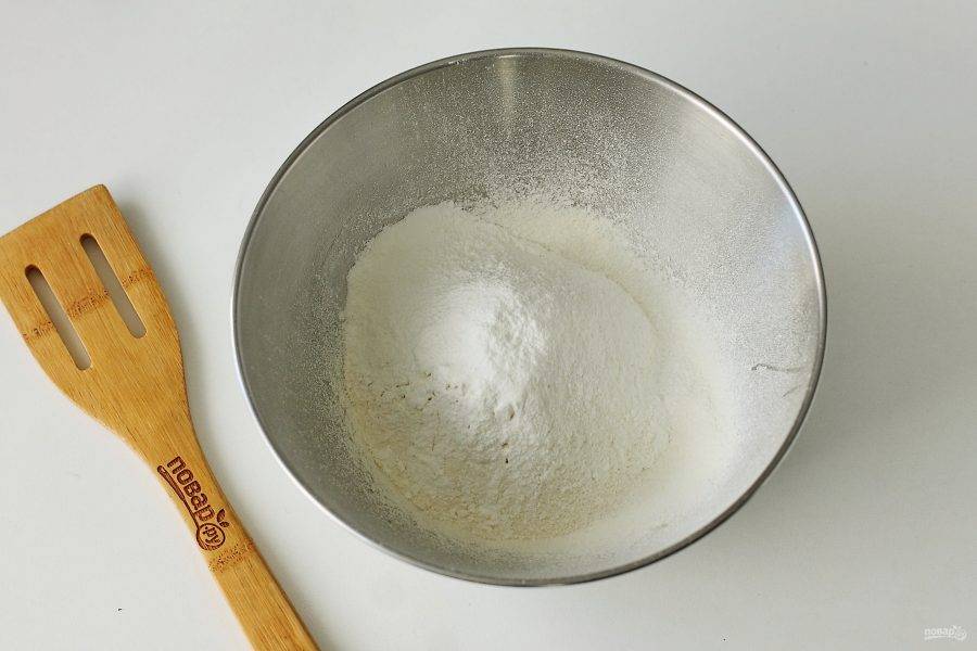 Соедините муку, разрыхлитель, крахмал и все просейте в глубокую миску.