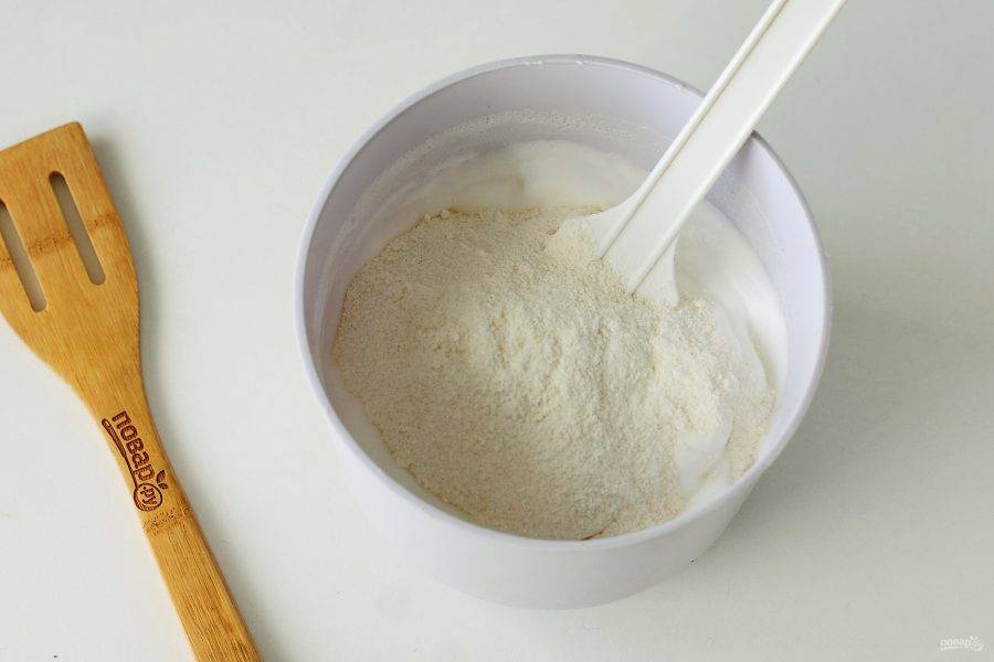 В три приема всыпьте смесь из сухих ингредиентов во взбитые белки.
