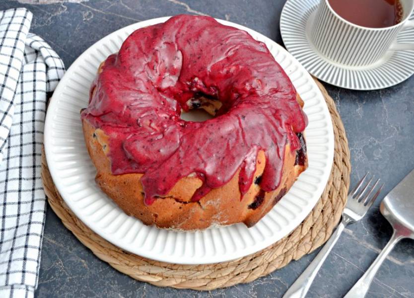 Смешайте смородиновое пюре с сахарной пудрой и нанесите ягодную глазурь на остывший кекс.