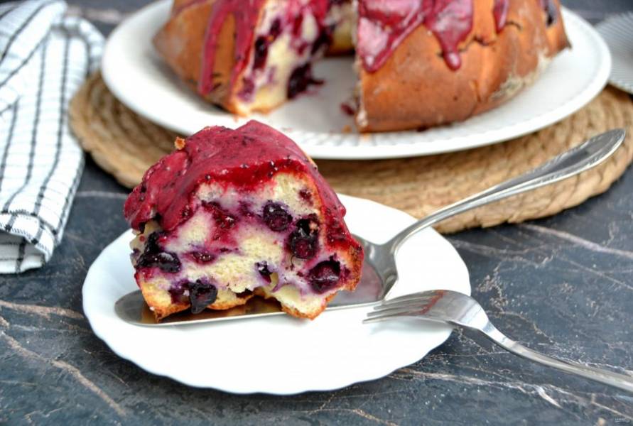 Кекс в разрезе, много ягод и они равномерно распределены внутри. Сверху вкусная и красивая смородиновая глазурь!