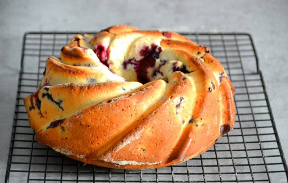 Готовый кекс извлеките из формы, охладите на решетке. Можно подавать кекс в таком виде или присыпать сахарной пудрой. Но я предлагаю приготовить ягодную глазурь из черной смородины.