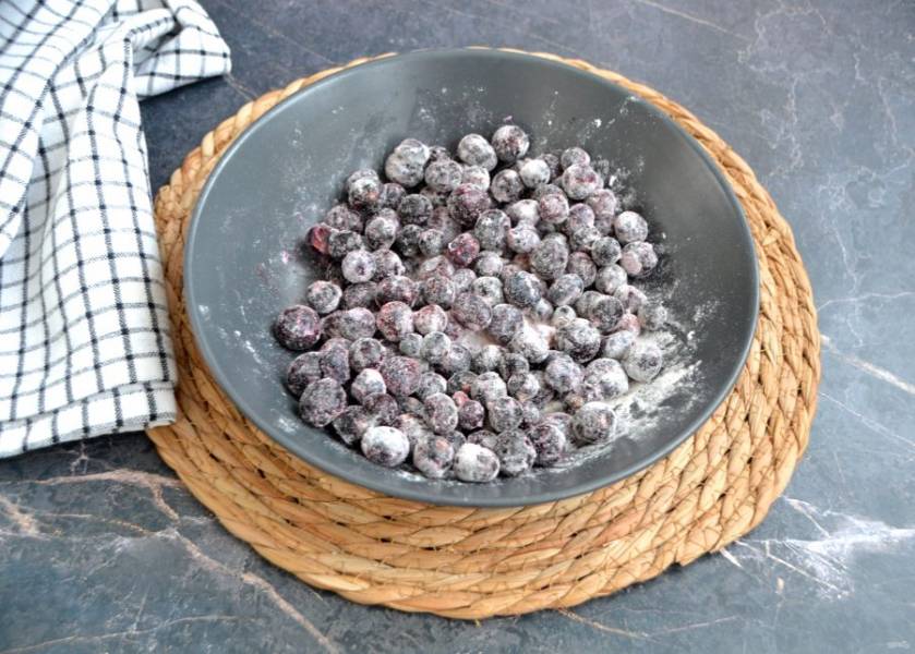 Встряхните ягоды с мукой, чтобы при введении ягод в тесто они не упали на дно формы, а ровномерно распределились по тесту.